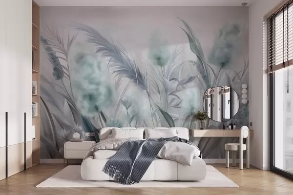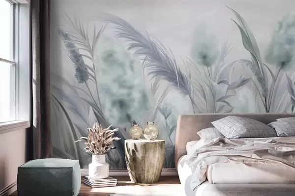 Fototapet Blåt og gråt pampasgræs og andre tørrede blomster med en blød, diset himmel i baggrunden Nr. w09635v1