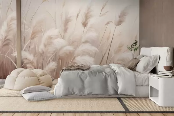 Fototapet Højt, struktureret pampasgræs i bløde, varme, neutrale toner med en sløret, lys baggrund Nr. w09637