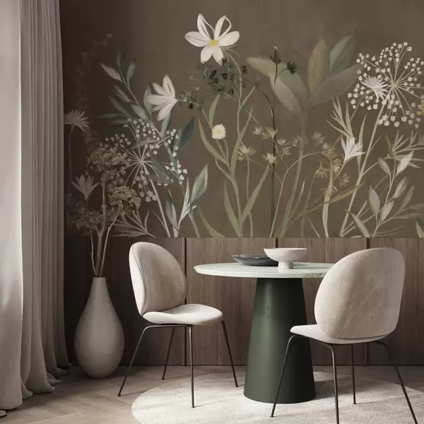 Fototapet Delikate vilde blomster og blade i dæmpede grønne og cremefarvede nuancer på en brun baggrund Nr. w09641v1