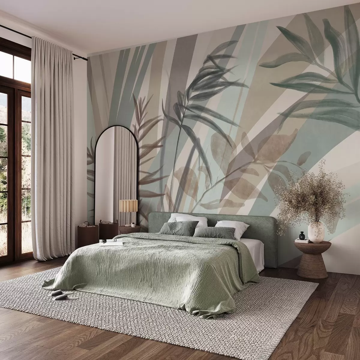 Fototapet Højt tekstureret græs og blade i dæmpede jordfarver med abstrakte linjer i baggrunden, der skaber et organisk print. Nr. w09643