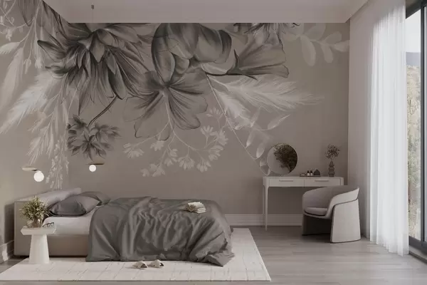 Fototapet Teksturerede blomster og bregner i mørkegrå og hvide nuancer på en dæmpet beige baggrund tegnet i stil Nr. w09644