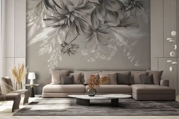 Fototapet Teksturerede blomster og bregner i mørkegrå og hvide nuancer på en dæmpet beige baggrund tegnet i stil Nr. w09644