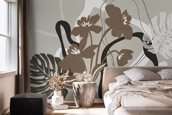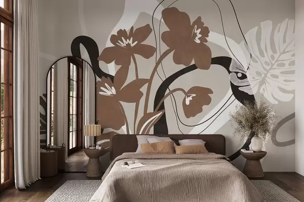 Fototapet Abstrakte brune blomster med hvid og sort tekstur på beige baggrund, minimalistisk kunst Nr. w09645v1