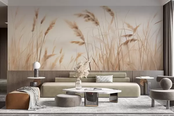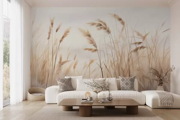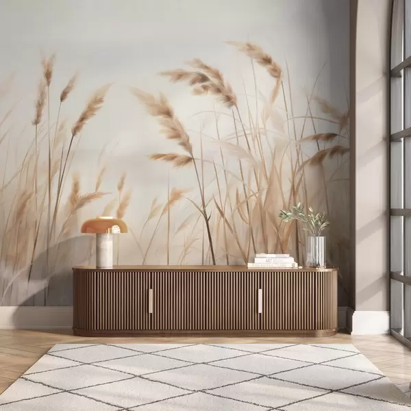 Fototapet Højt, struktureret tørt græs med hvedekorn i marken mod en blød, lys baggrund Nr. w09648