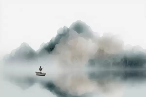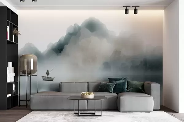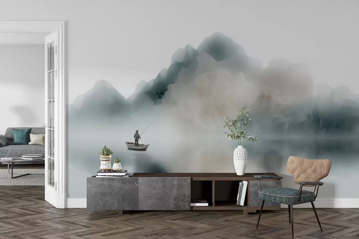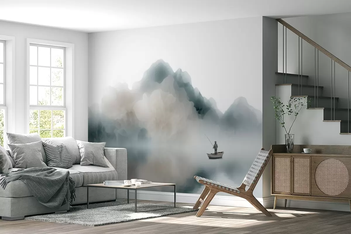 Fototapet Bjerglandskab med en båd og en fisker, der forsvinder i den bløde tåge Nr. w09678