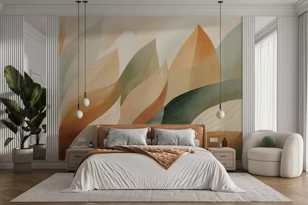 Fototapet Abstrakte blade, dæmpede jordfarver i grøn og orange med fine linjedetaljer, blød akvarelstruktur Nr. w09736