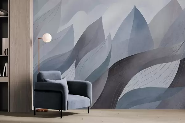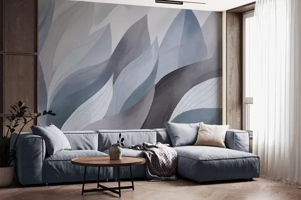 Fototapet Abstrakte blade, dæmpede jordfarver i blå med delikate linjedetaljer, blød akvareltekstur Nr. w09736v1