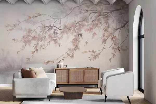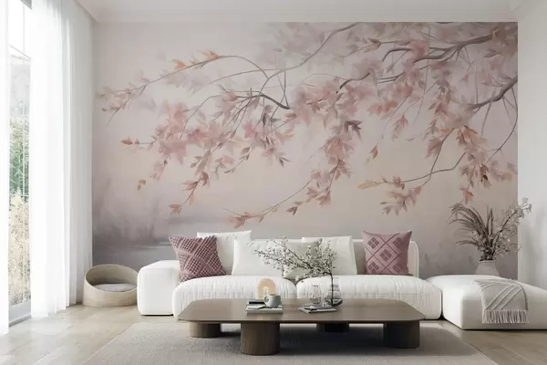 Fototapet Tekstureret landskab med kirsebærblomstgren, lyserøde blade, blød, tåget baggrund Nr. w09743