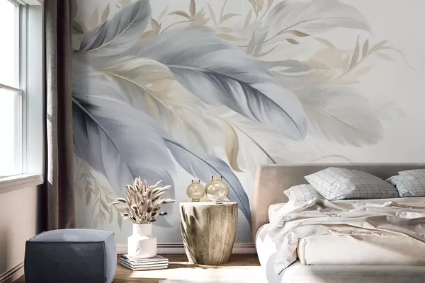 Fototapet Fjer i pastelfarver med struktur og fine blade på en lys baggrund Nr. w09763