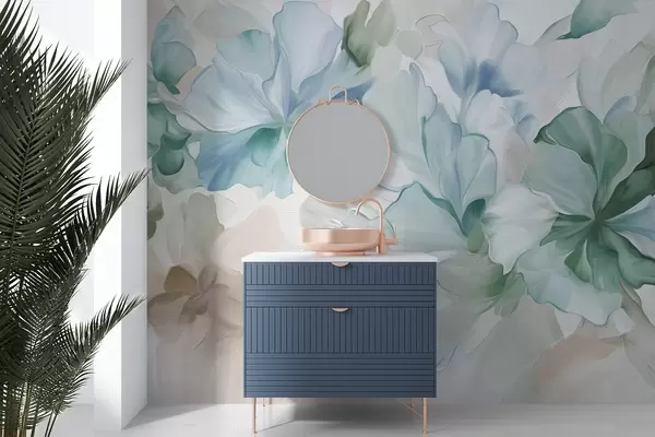 Fototapet Abstrakte fantasiblomster i grønne, blå og beige nuancer i malerisk stil, tekstureret kunst Nr. w09767v1