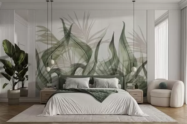 Fototapet Tropiske blade i beige og grønne nuancer på hvid baggrund, tekstureret akvarelstil Nr. w09772v1