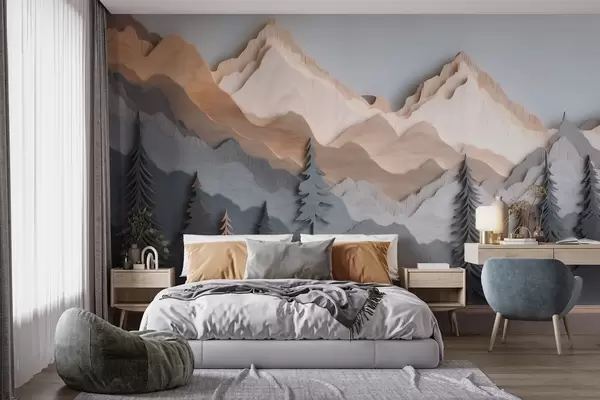 Fototapet Naturlandskab med fyrretræer og bjerge i udskåret træstil Nr. w09793