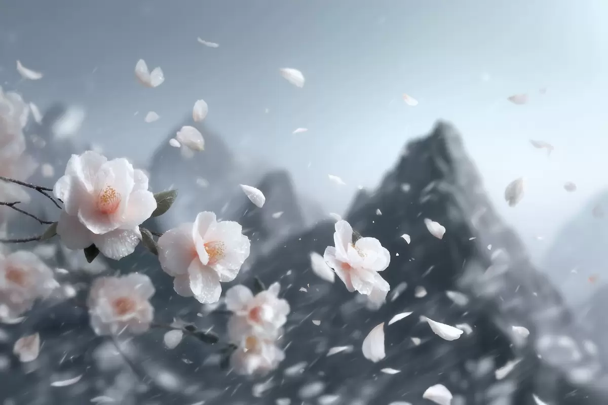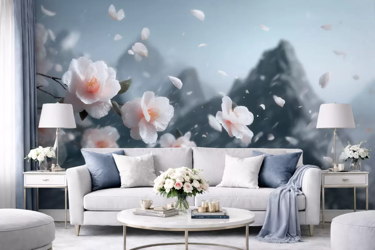 Fototapet Delikate kirsebærblomster med bjergene i baggrunden, et stemningsfuldt japansk landskab i pastelfarver Nr. w09808