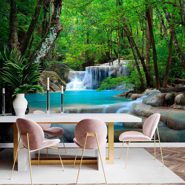 Fantasi-landskab med flod, hus og fugle blandt træer