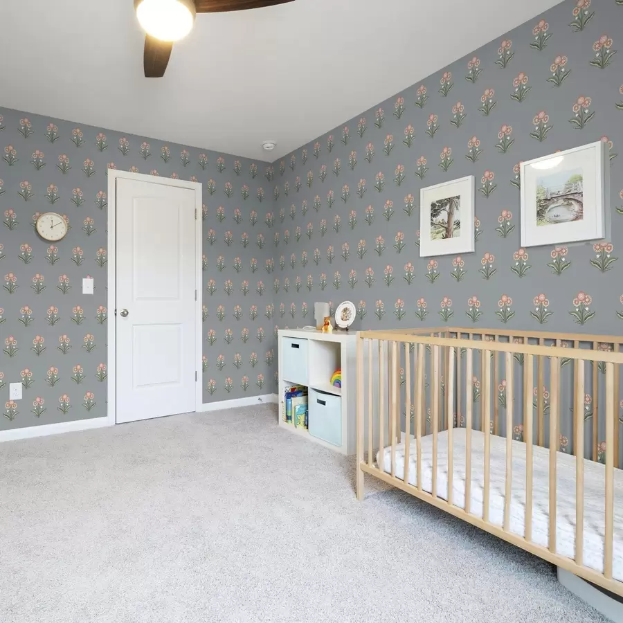 Små blomster i lyserøde og blå toner på en cremefarvet baggrund