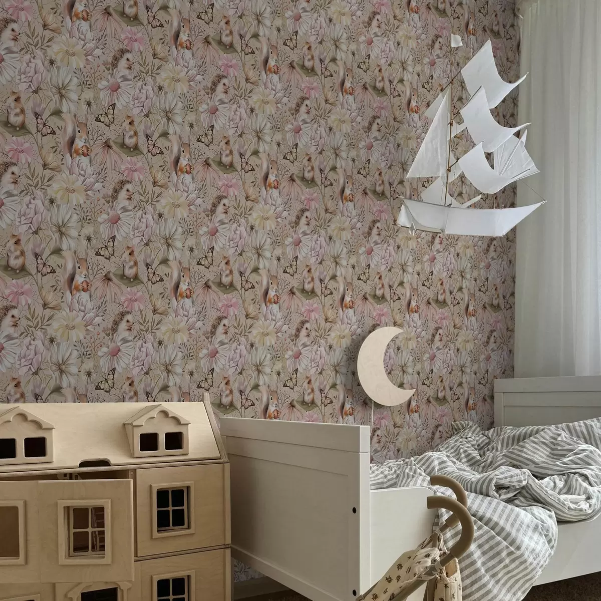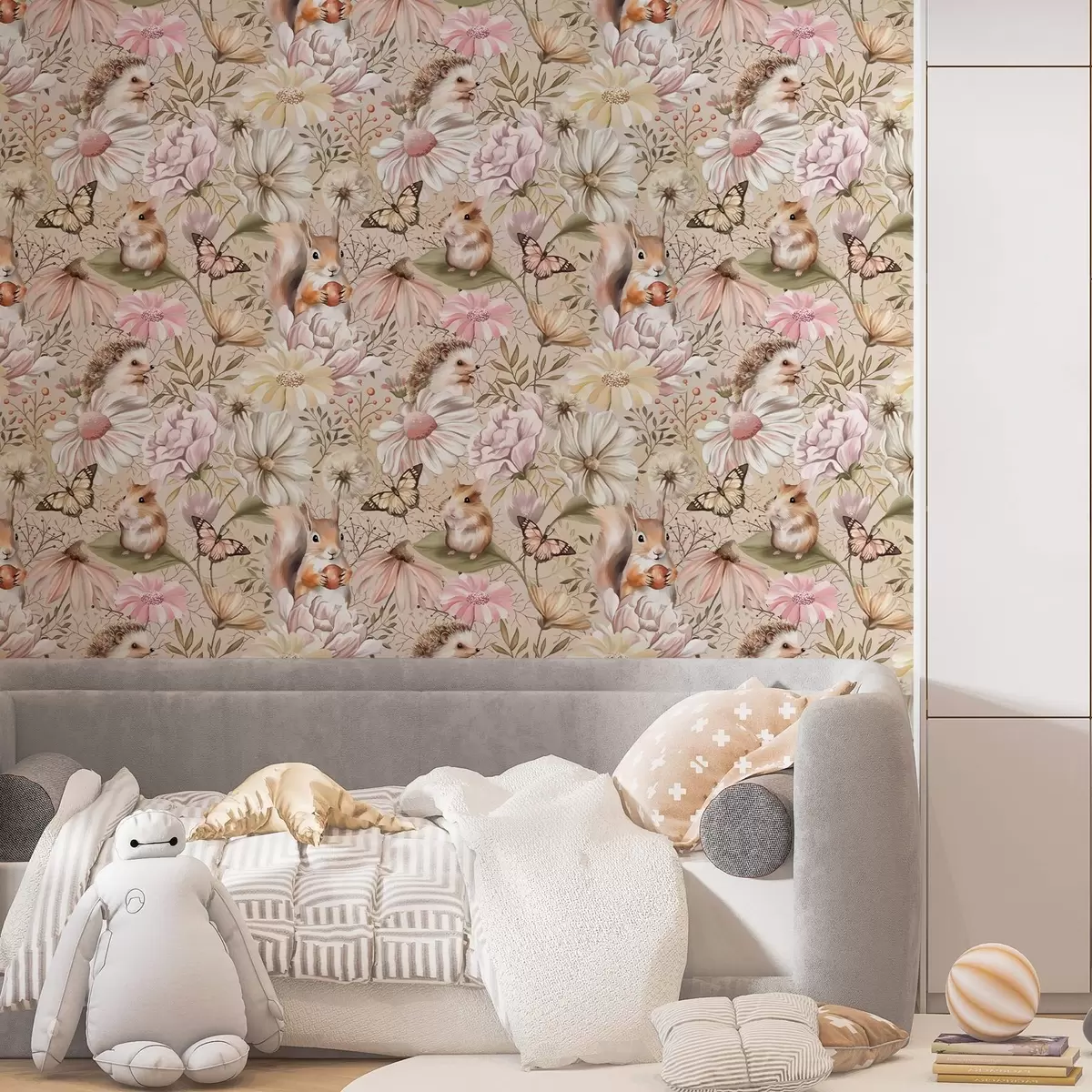 Baggrunde Sødt pindsvin, egern, hamster og sommerfugle med blomster i pastelfarver Nr. a00051