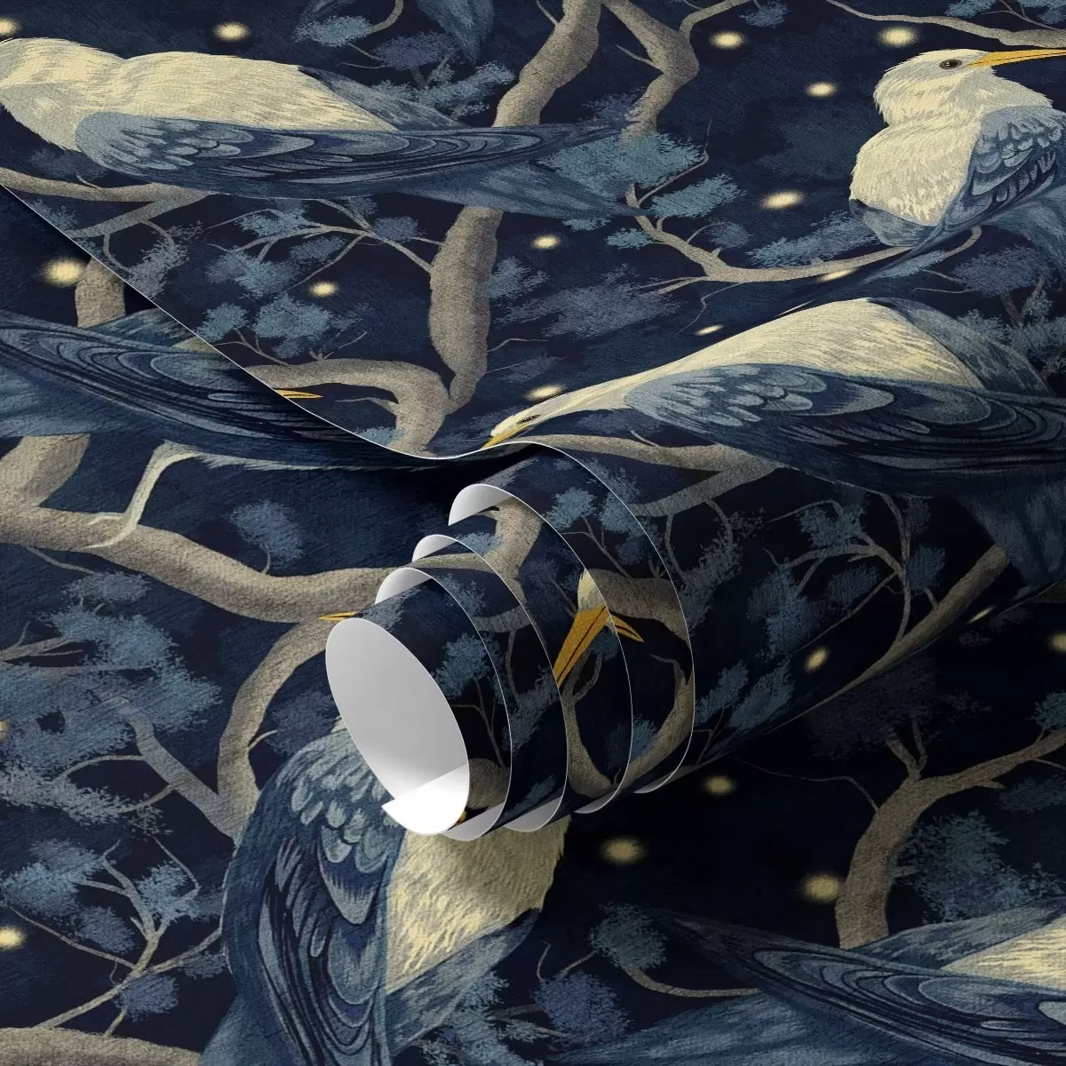 Baggrunde Hvide fugle på grene blandt lysende ildfluer i natskoven Nr. a00109