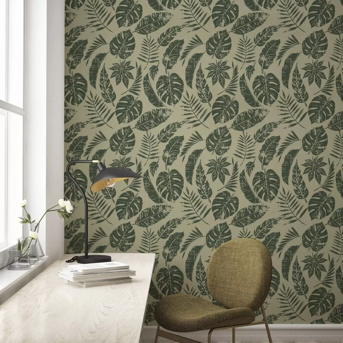 Baggrunde Tropiske blade i linoleumssnit, grøn på gul Nr. a00274