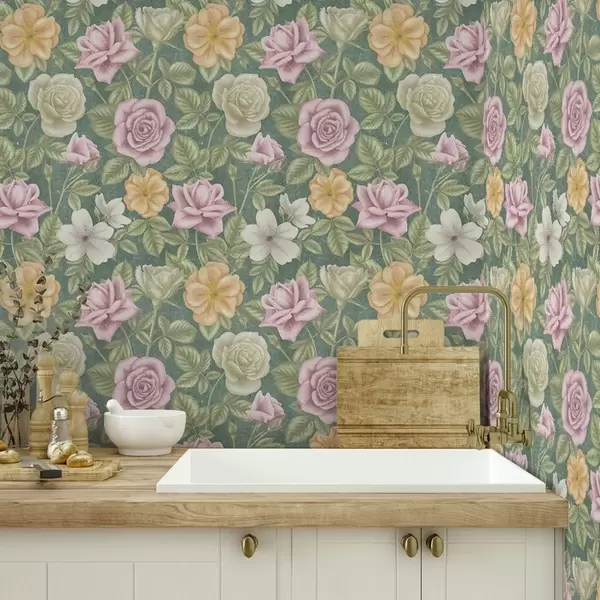 Baggrunde Lyserøde, cremefarvede og gule roser på en grøn baggrund Nr. a00300