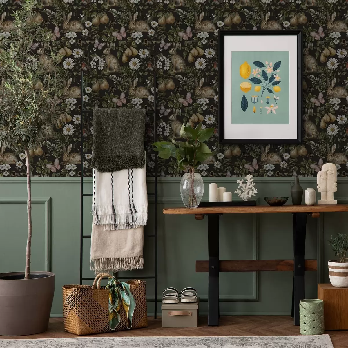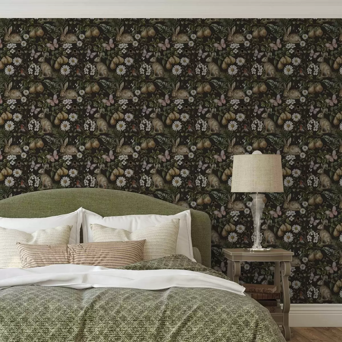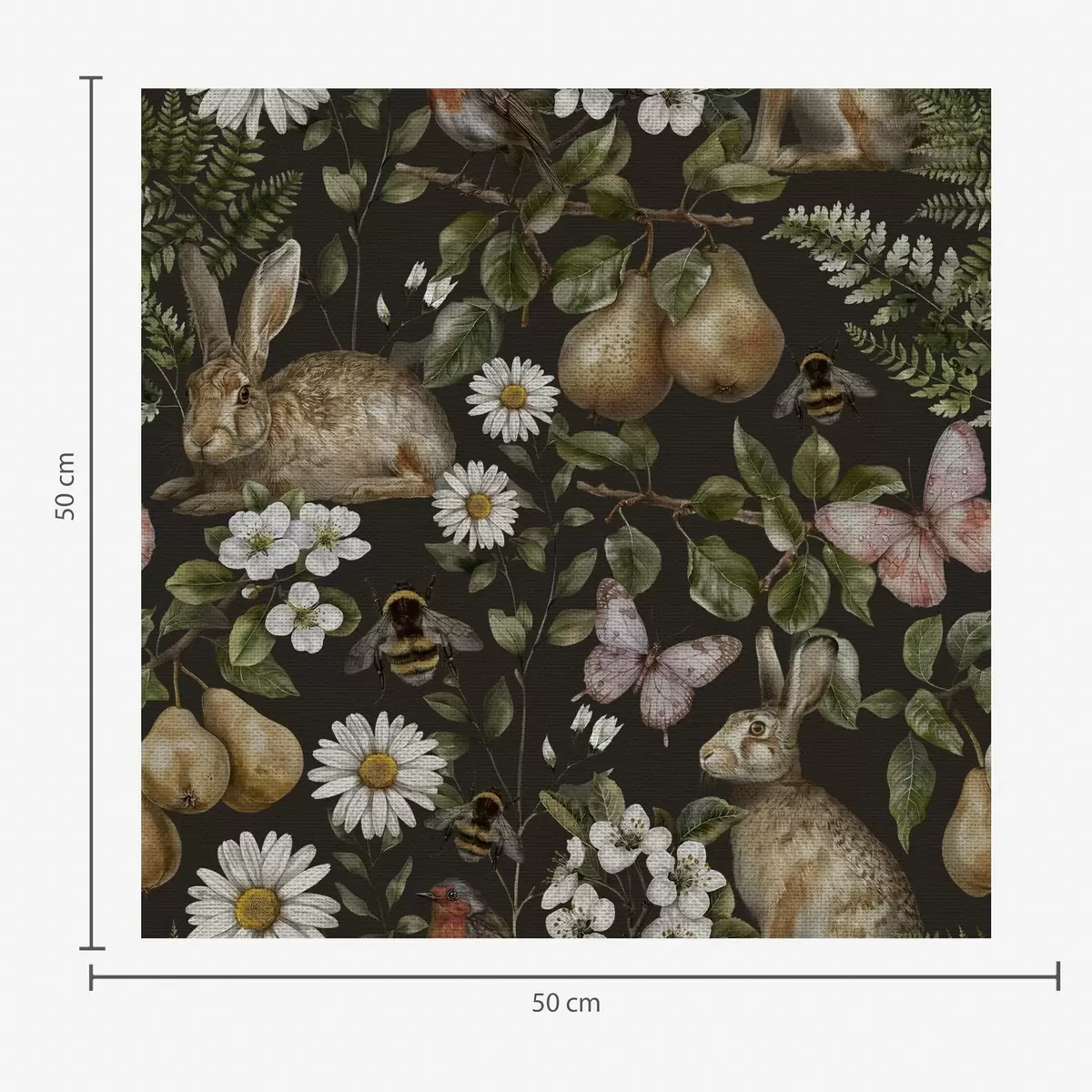 Baggrunde Realistiske kaniner, pærer, blomster og insekter på en mørk baggrund Nr. a00401