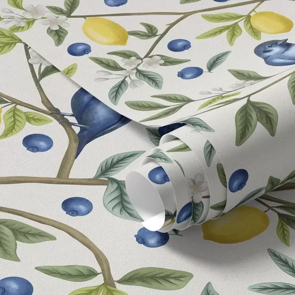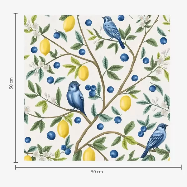 Baggrunde Blå fugle, citroner og bær på hvid baggrund Nr. a00668