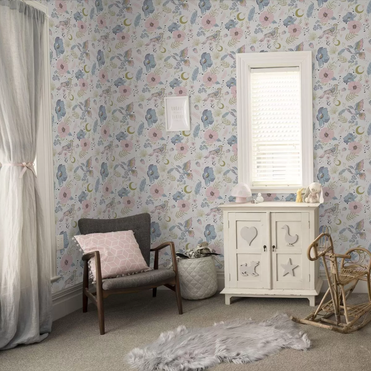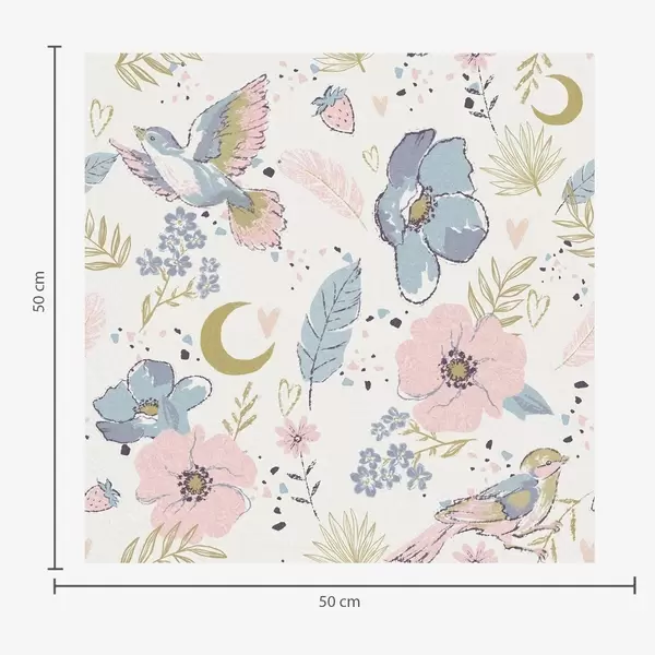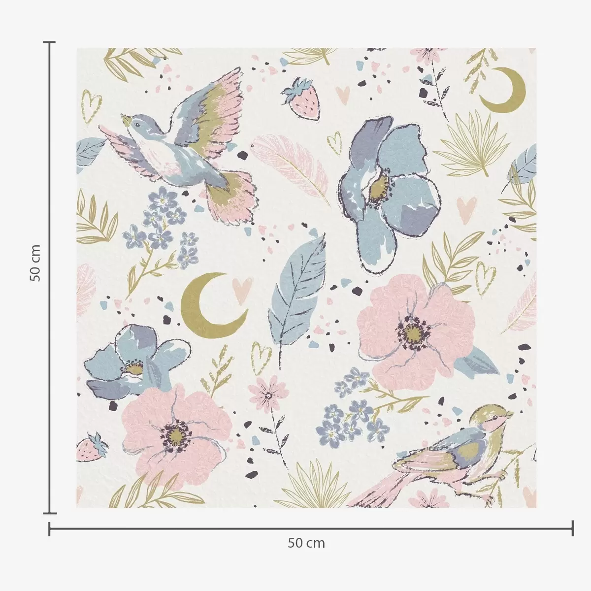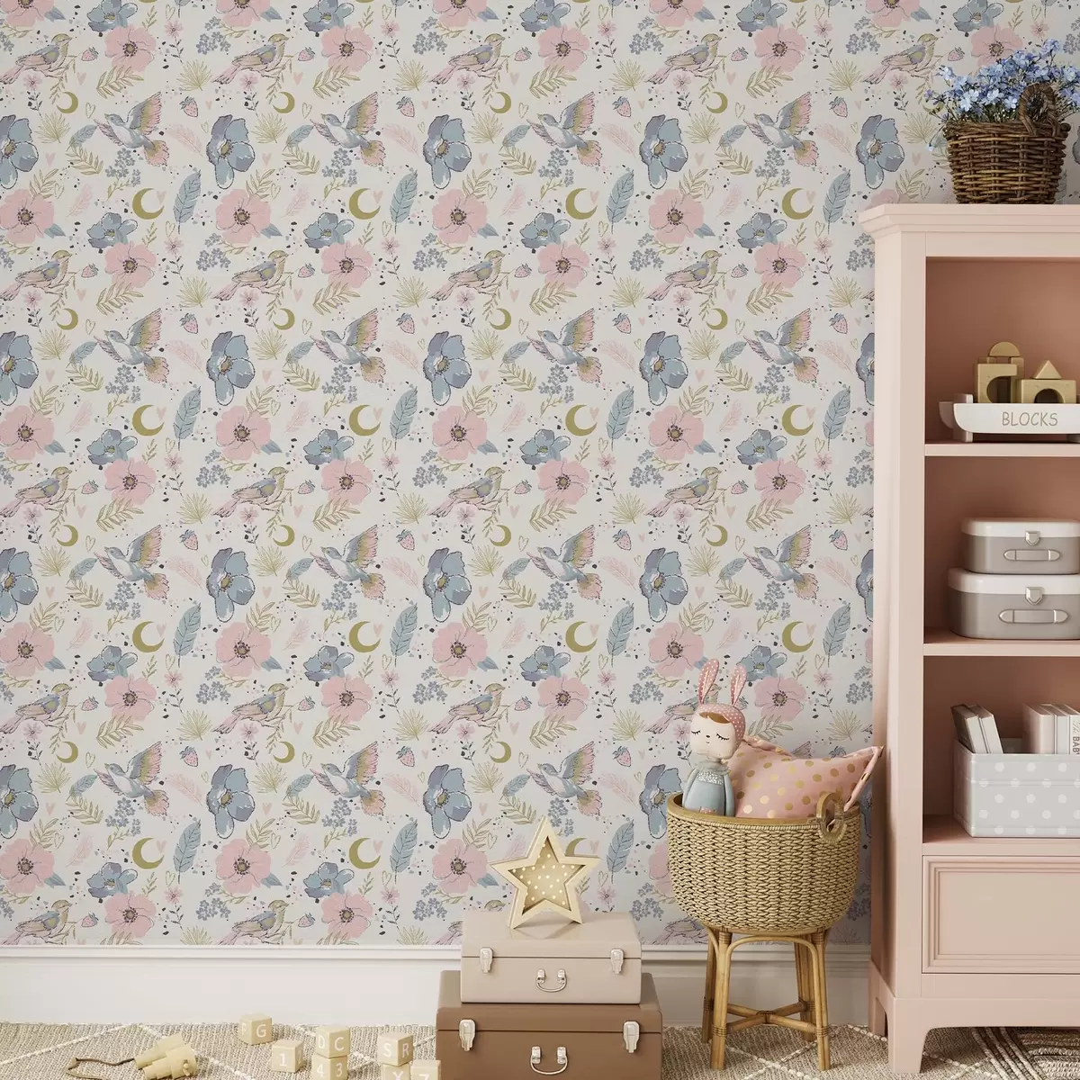 Baggrunde Pastelfarvede fugle og blomster med halvmåner på hvid baggrund Nr. a00721