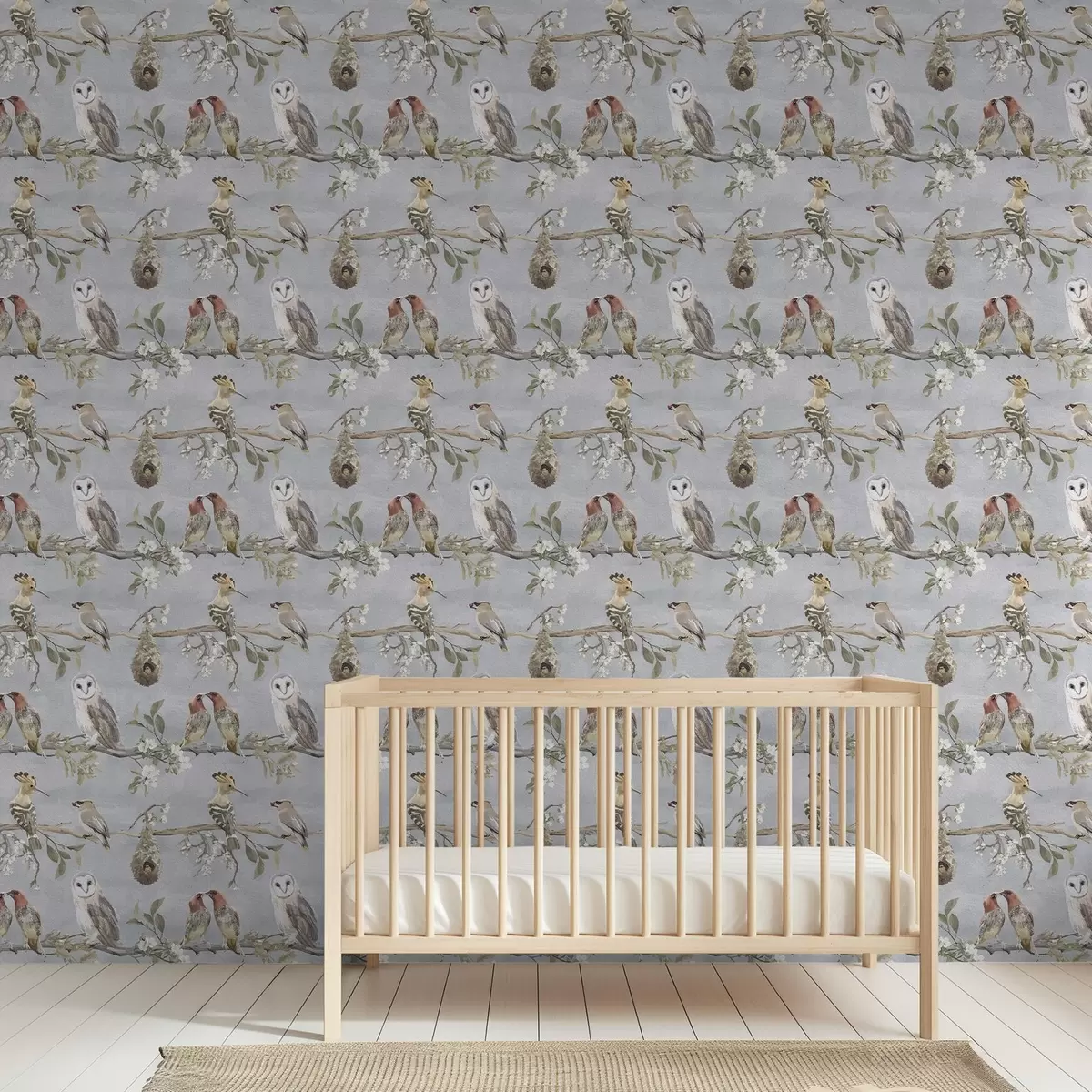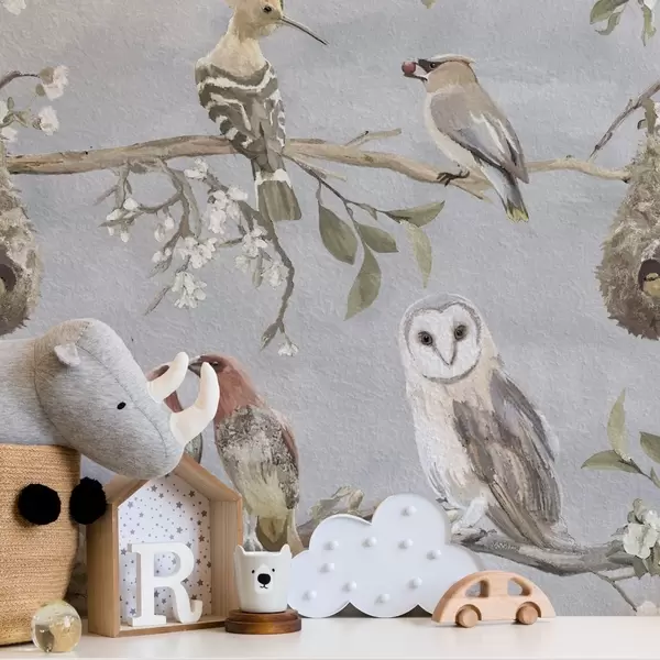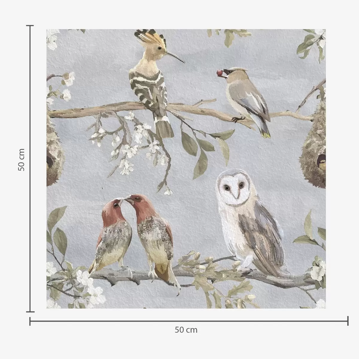 Baggrunde Fugle på grene med blomster på grå baggrund Nr. a00738