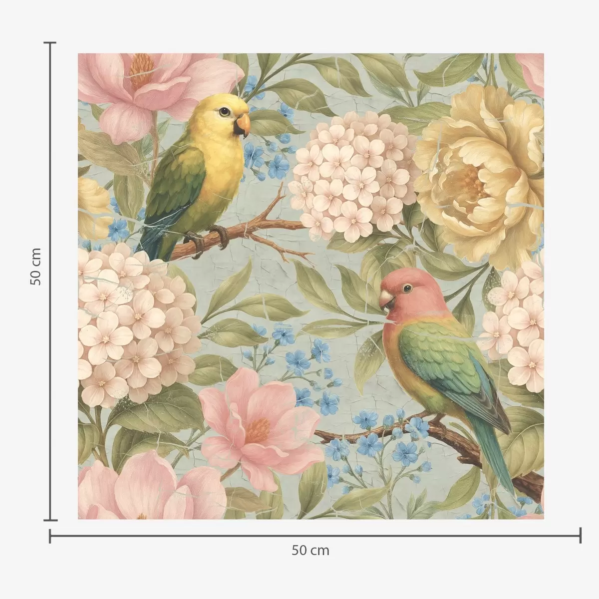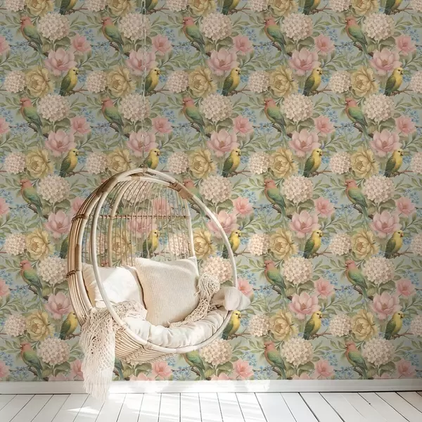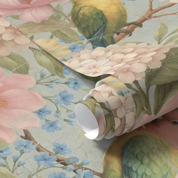 Baggrunde Papegøjer blandt pæoner, hortensiaer og magnolier Nr. a00747