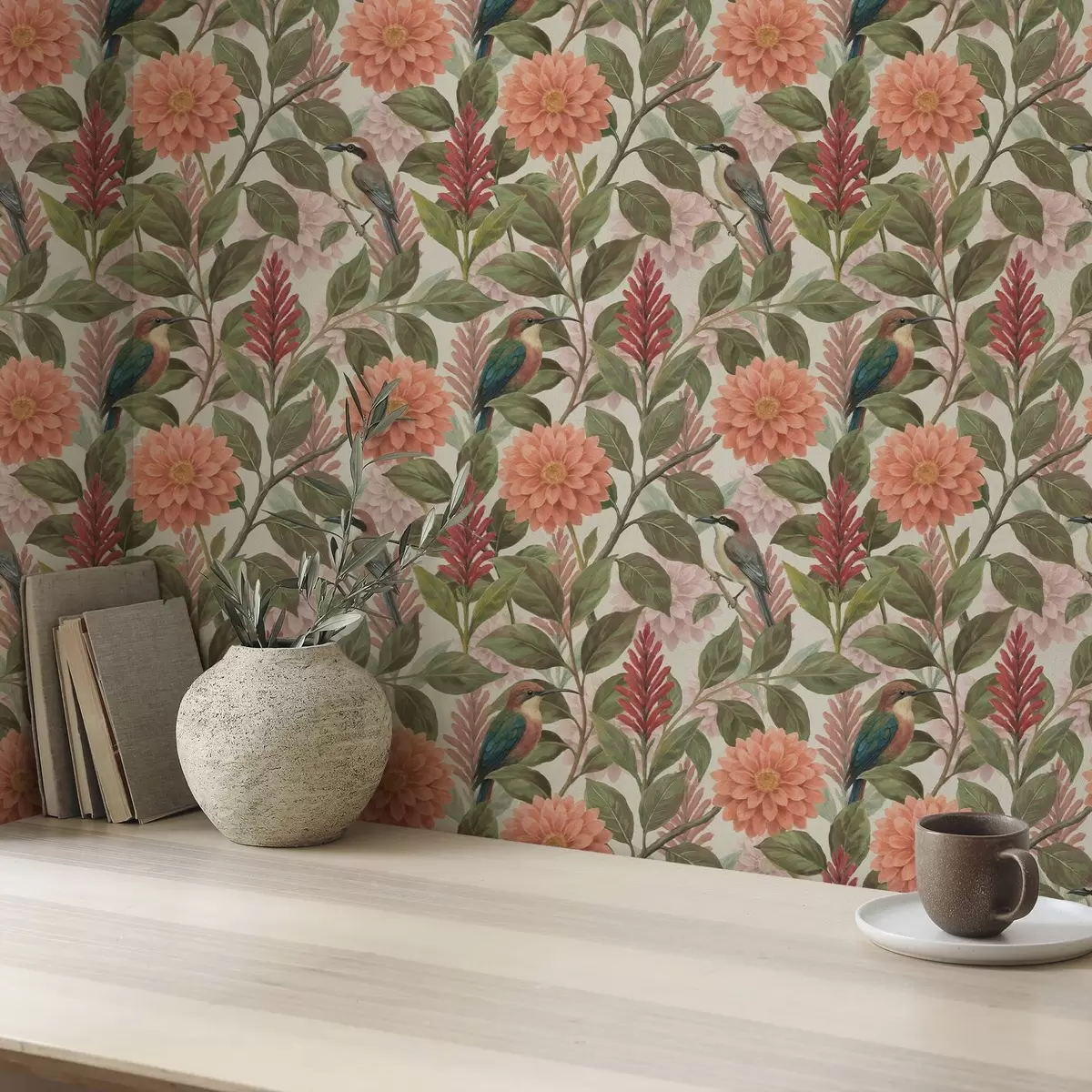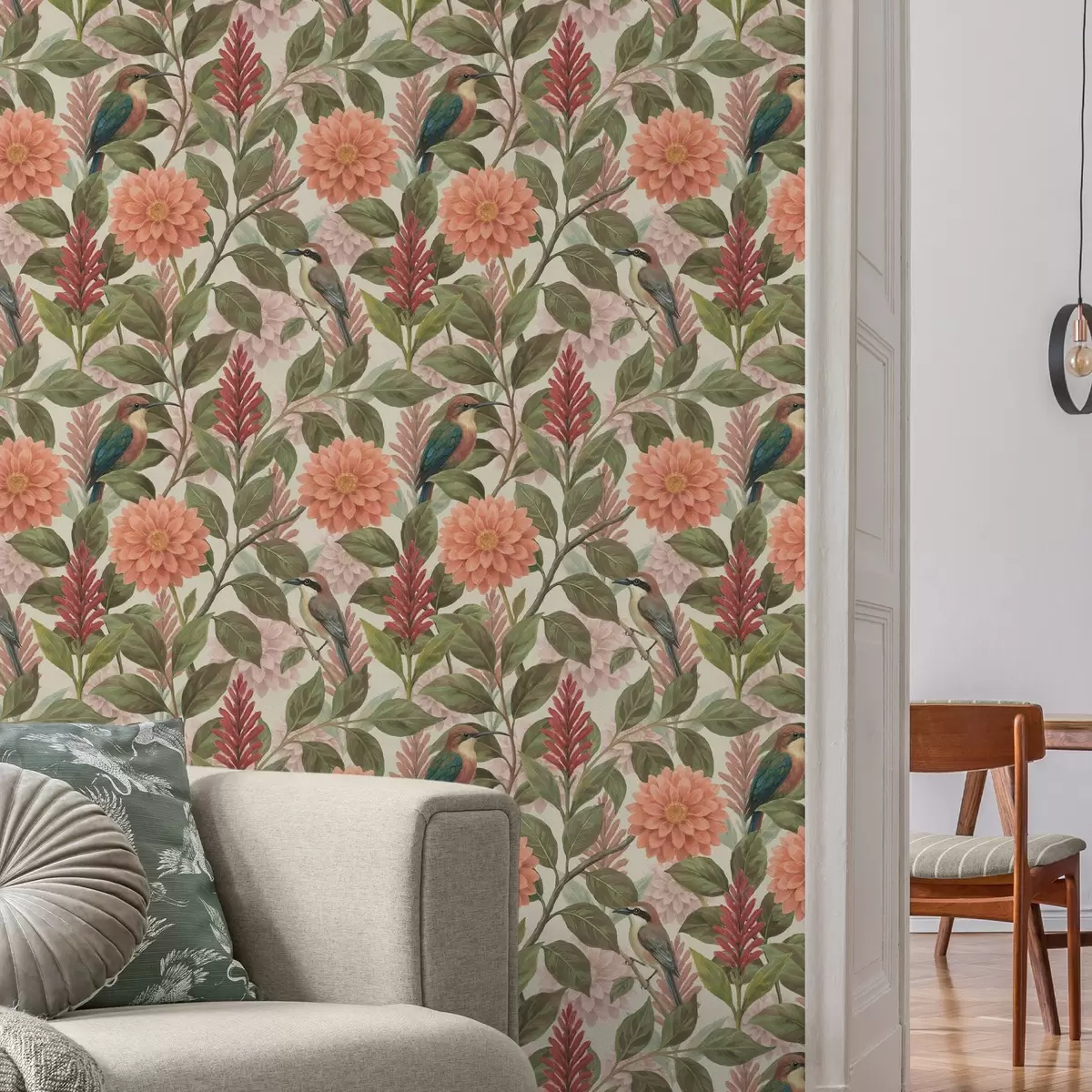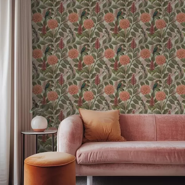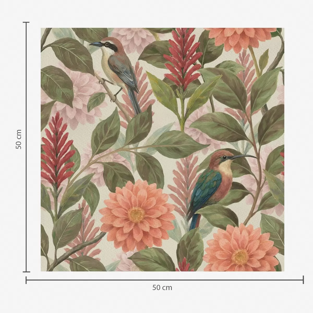 Baggrunde Fugle blandt blomster og blade i varme farver Nr. a00753