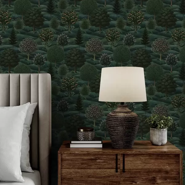 Baggrunde Riggrønt, bølgende landskab med mønstrede træer Nr. a00892