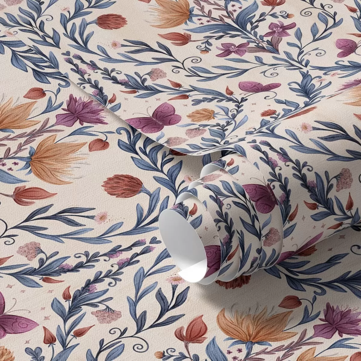 Baggrunde Blomstret damask med sommerfugle på blød ferskenfarvet baggrund Nr. a00926