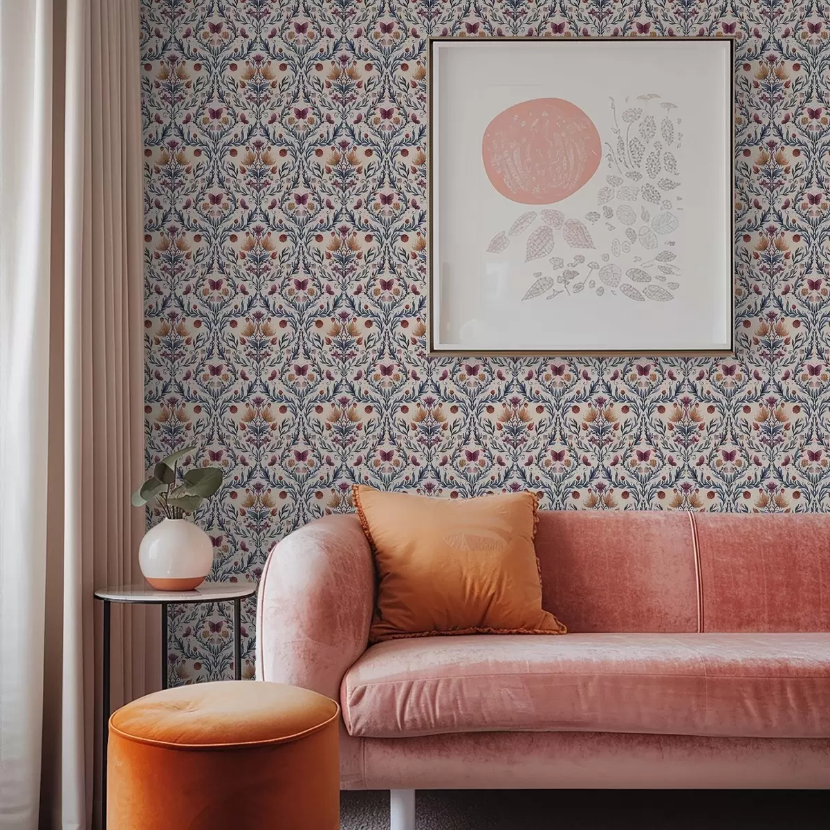 Baggrunde Blomstret damask med sommerfugle på blød ferskenfarvet baggrund Nr. a00926